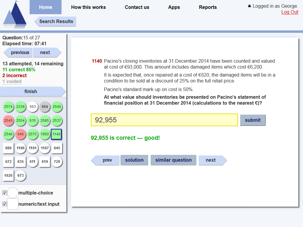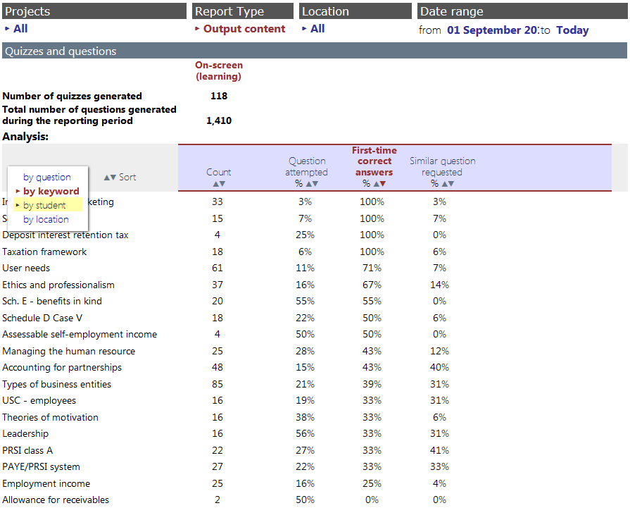 o Whether a 'similar question' is selected (in 'learning' mode) (Yes or no);